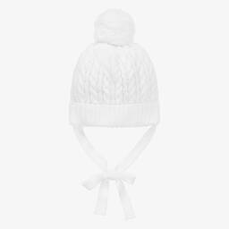 Cute off-white hat for younger boys and girls by Paloma de la O. Traditionally styled, with a rolled edge and a lovely pom-pom on the top, it is made in a soft, mid-weight knit with wool for added warmth. To keep it in place, there are knitted ties to fasten under the chin.