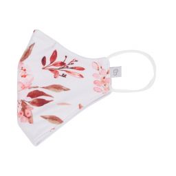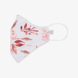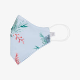 Pretty blue face mask for girls by Patachou, with a blue, green and pink floral print. It is made in soft satin with a polyester layer inside, and has elasticated ear loops.