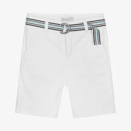 Classic navy blue Bermuda shorts for boys by Patachou, with a removable striped belt in white and red. Soft and comfortable, they are made in stretchy cotton twill with a slightly washed look. They have an adjustable waist for an ideal fit, a button and zip fastening, and three useful pockets. For a subtle designer touch, there is an embroidered tonal logo on the back.