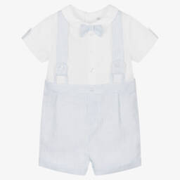 Ivory and navy stripe shortie for baby boys by Patachou offers a touch of summer charm. Crafted with a soft jersey cotton top accented with navy piping and decorative buttons, it features a striped, linen-blend lower section with faux pockets. The shortie ensures ease with back buttons and poppers between the legs. Designed for spring and summer, this item is ideal for warm days, promising both style and comfort. Limited quantities available, don't miss out.