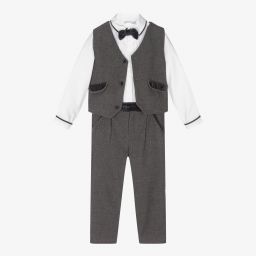 An ivory ceremony suit for boys by Patachou, designed in a silky textured fabric. The single-breasted blazer features pointed lapels, a decorative chest pocket, and neat flap pockets, fastening with fabric-covered buttons. The coordinating shorts have a three-pocket design, fixed fold-up hems, and an adjustable waist for a tailored fit. Completing the ensemble is a lightweight linen and cotton blend shirt embroidered with a heritage logo emblem. Limited quantities available, last chance to buy.