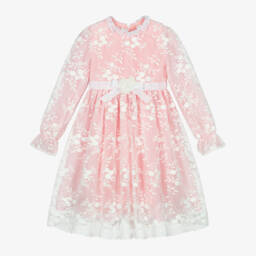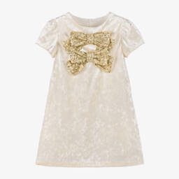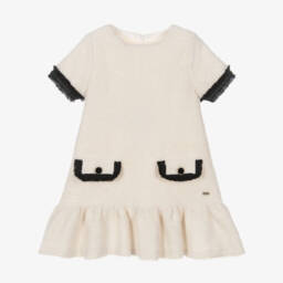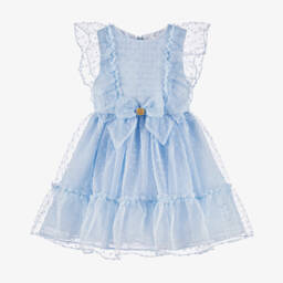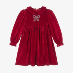 Red and navy blue tartan check dress for baby girls by Patachou. Made with a soft, midweight polyester and viscose blend, it has a sweet white ruffle collar, elasticated cuffs and a small red velvet bow. It fastens with buttons on the back, and has a soft, lightweight lining for comfort.