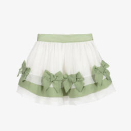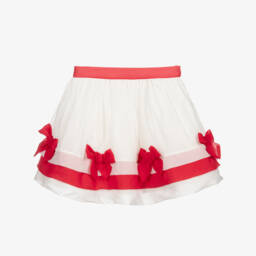 White skirt for girls by Patachou, made in soft, lightweight chiffon, with navy blue trims and bows. It has a double cotton lining, with soft tulle for added volume. It fastens with a button and zip on the side and has a useful adjustable waist.