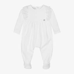 In a lovely shade of sage green, this soft cotton jersey babygrow for girls is by Paz Rodriguez. Classically styled, it has a pretty ivory ruffle collar and delicate lace trims down the front. Fastening easily with poppers on the back and between the legs, it has the brand's signature mother-of-pearl logo charm and ribbon bow on the front.