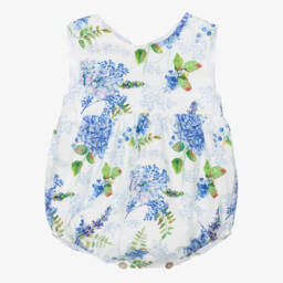 A pink cotton shortie for baby girls by Portuguese brand Phi Clothing, patterned with black polka dots. Cute and classic, this shortie has a stretchy ruched bodice with a bow decorated on the front. The shoulder straps cross over and fasten at the back, with mother-of-pearl button fastenings between the legs. There is a soft cotton voile lining for comfort against the skin.