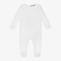 Boys blue cotton babygrow by Piccola Speranza is a perfect blend of comfort and style. Made from soft organic cotton jersey, it is gentle on delicate skin. Featuring a woven collar, striped bib front, and feet, it also has convenient popper fastenings on the back and between the legs. The pearlescent branded plate adds a subtle designer touch. Limited quantities available, making it a last chance to buy this lovely babygrow.