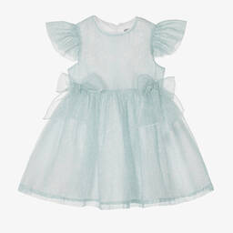 The girls mint green floral chiffon dress by Piccola Speranza is softly woven in luxurious chiffon. Fully lined in white cotton, this beautiful occasion dress features a muted floral pattern and charming fixed bows on the waistline. The short capped sleeves cover the shoulders, and it has a neatly concealed zip fastening on the back. Limited quantities available, so do not miss your last chance to buy this elegant piece for the upcoming season.