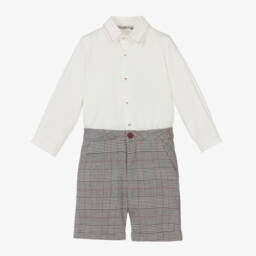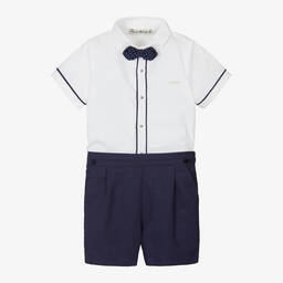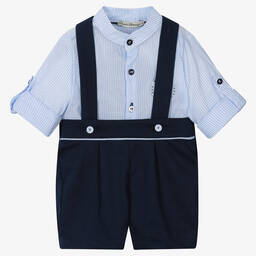 Pretty pink bloomer shorts set for little girls by Piccola Speranza. The white cotton twill blouse has a pink floral collar, elasticated frilled cuffs, and a back popper fastening. The pink knit sweater has floral twill trims on the shoulders, bows on the front with blue velvet detailing, a mother-of-pearl logo charm sewn on one side and popper fastenings around the back. The floral twill bloomer shorts have a pink-edged frill with a navy blue trim.