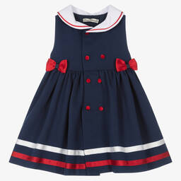 A traditional sailor dress for girls by Piccola Speranza, in white with navy blue and red trims. This smart dress is woven in a softly textured cotton blend and has a lightweight cotton voile lining for comfort. There are pretty grosgrain ribbon bows on the sides, with a double-breasted button fastening on the front.