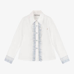 Girls pretty white crêpe blouse by Piccola Speranza, with yellow trims and navy blue piping. It has a stylish ruffle on the bodice, a navy blue grosgrain ribbon bow with diamanté, and ruffled three-quarter length sleeves.There is a soft lining at the front for modesty and comfort.