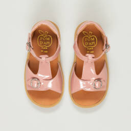 Sweet white leather sandals for younger girls by Pom d'Api, with velcro fastenings. There two straps on the uppers, with sparkly silver, blue and pink flower and leaf appliqués across the foot. They have a brown leather footbed and non-slip rubber outer sole.