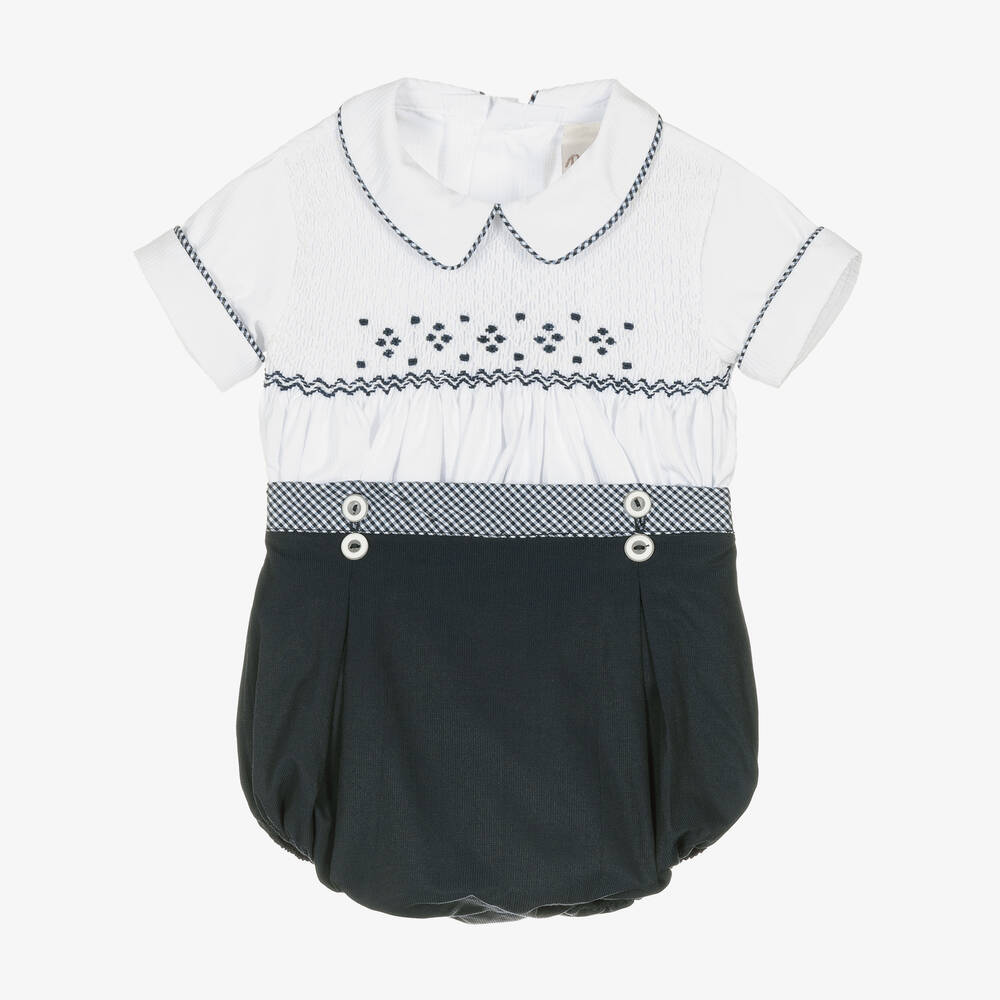 The boys navy blue smocked buster suit by Pretty Originals is a traditional white and navy blue shorts set made from a soft cotton blend. The top features beautiful hand-smocking and hand-embroidery, with gingham piping on the collar and cuffs. Button fastenings on the back and larger buttons attaching to the shorts ensure a neat look. The navy blue bubble shorts have inverted pleats and an elasticated waistband and cuffs for a comfortable fit. Limited quantities available.