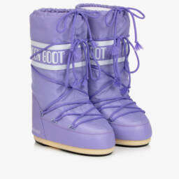 Inspired by the Apollo-11 moon landing, these lilac purple snow boots for teen girls are by Moon Boot. A must-have après-ski look, the ultra resistant nylon is heavily padded in the original style with a bold white logo printed panel. They feature a two-tone thermoplastic sole with little suction pads at the bottom for improved grip with stylish tie-up laces and drawstring ties on the cuffs for a good fit. Further logo branding can be seen on the heels. The technological foam lining will feel snug at first but will mould to the size and shape of the foot after a few hours of wear.