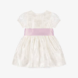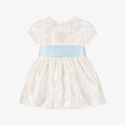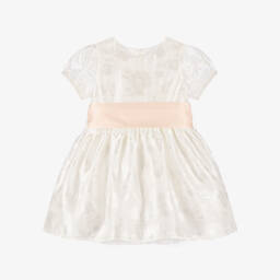 An elegant special occasion dress for girls by British designer Rachel Riley. This beautiful design is made in silky organza jacquard, with pretty puffed sleeves and a green satin sash to tie around the waist. Fastening with a concealed zip on the back, the dress is fully lined in cotton voile for comfort, with a layer of stiff tulle adding volume in the skirt. For an alternative look, it comes with an additional sash in tonal ivory.