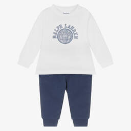 Smart casual trouser set for baby boys by American designer Ralph Lauren, made in lightweight cotton. The striped, multi-coloured shirt has the brand's signature pony logo embroidered on the chest in brown and fastens with buttons on the collar, front and cuffs. The beige chino trousers have a button fastening on the waistband, which has a comfortable elasticated section on the back for a good fit. The brand's signature pony logo is embroidered in navy blue above the button-down back pocket.