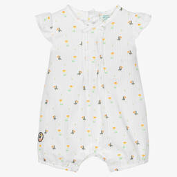 Girls blue floral polo shortie by Ralph Lauren is a charming addition to any wardrobe. Crafted from soft, comfortable piqué fabric, it features a vibrant blue, green, and yellow floral print on a white background. The design includes a ribbed white collar, matching cuffs on the short, puffed sleeves, and a flared skirt overlay. Easy dressing is ensured with logo buttons on the front and poppers between the legs. Limited quantities available.