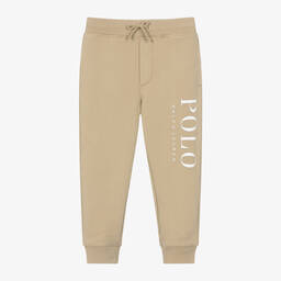 Boys beige cotton joggers offer sporty style by Ralph Lauren, featuring a bold white logo on one leg. Made from a soft cotton-blend jersey, they ensure maximum comfort with a drawstring waist and handy side seam pockets. The iconic pony logo is embroidered on the back pocket. Limited quantities available.