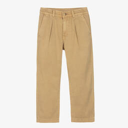 Casual chino-style trousers for boys by Ralph Lauren, in a washed beige shade. Made in soft cotton twill, they have pleats on the front for a comfortable relaxed fit. The elasticated waistband has an internal drawstring tie and they fasten with a zip and button. There are slanted front pockets and a single back patch pocket with an embroidered signature pony logo above for a discreet designer finish.