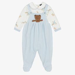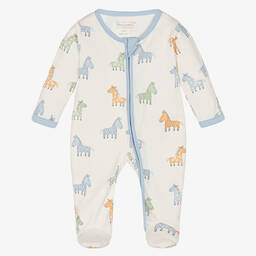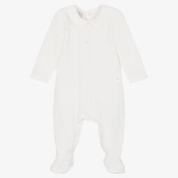 A charming boys white bear babygrow by Ralph Lauren, crafted from luxuriously soft jersey. The delightful grey nursery-themed prints feature adorable teddy bears, elephants, and alphabet blocks, adding a whimsical touch. Designed with practical popper fastenings on the front and convenient fold-over scratch mitts, it combines style with functionality. Its cosy fabric ensures comfort, making it ideal for spring and summer wear. Limited quantities available, offering a last chance to buy.