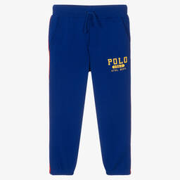 Bright yellow joggers for boys by Polo Ralph Lauren, made in comfortable and easy-wearing cotton jersey. Packed with sporty personality, they have a blue varsity logo print on the front and green, white, and navy blue logo tape on the sides. Still remaining functional, they have useful front pockets and a drawstring waist.