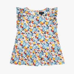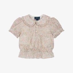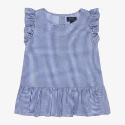 The girls blue striped cotton blouse by Ralph Lauren is a charming piece for warm weather. Crafted from soft and lightweight seersucker cotton, it features short sleeves with a pretty ruffle trim and a white scalloped embroidered edge. The iconic pony logo is embroidered near the hemline for a signature touch. The blouse includes a gathered panel across the chest and pearlescent button fastenings on the back, offering a classic style. Limited quantities available, last chance to buy.