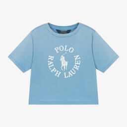 A girls green cotton jersey t-shirt by Ralph Lauren, featuring a soft fabric and a sporty look with the signature pony logo surrounded by a white circular print. This short-sleeved, boxy tee offers a crew neck and tonal topstitching on the back. Ideal for casual wear, it ensures comfort and style in limited quantities available.