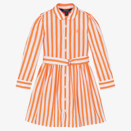Pretty smart-casual green and white striped shirt dress for girls by Ralph Lauren. Woven in lightweight cotton poplin, it has the brand's signature pony logo embroidered on the chest in pale green. Button fastening, it has discreet side seam pockets, and there is a matching detachable belt, which can be adjusted, for a stylish silhouette.