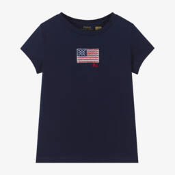 Navy blue T-shirt for girls by Ralph Lauren, made in soft cotton jersey. Casual and comfortable, it has a charming embroidered American flag and RL monogram on the front, for a distinctive finish.