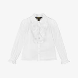Green, navy blue and ivory cotton blouse for teen girls by American brand Ralph Lauren, with an eye-catching ruffle front. Made in super soft, comfortable, brushed twill, it fastens with buttons on the front and cuffs. The blouse is slightly fitted around the back for feminine fit and has the designer's signature pony logo embroidered on one cuff in green.