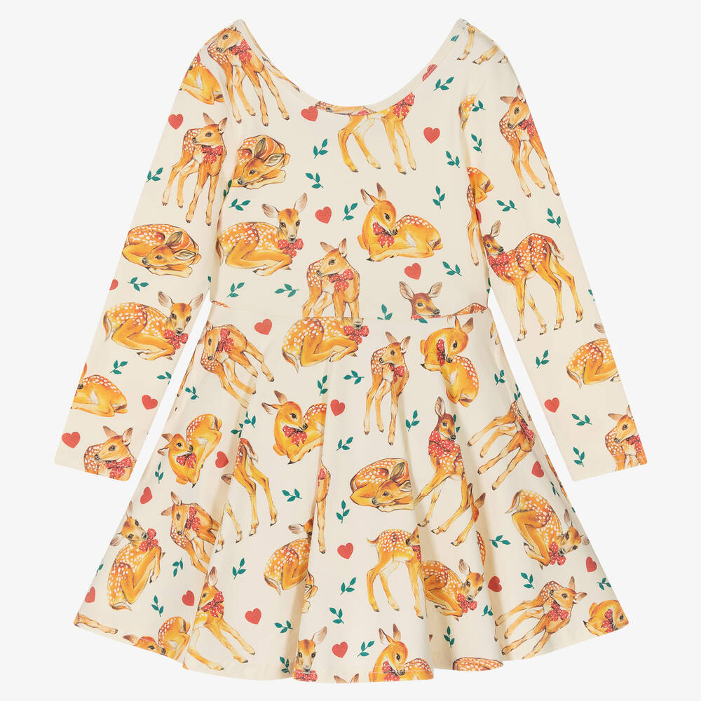 Little girls ivory and beige cotton dress from Rock Your Baby. This skater dress is made in stretchy, lightweight jersey, with sweet vintage-style spotted fawn motifs, botanical leaves and heart prints. Comfortable and easy to wear, it has a feminine scooped neckline and useful front pockets.