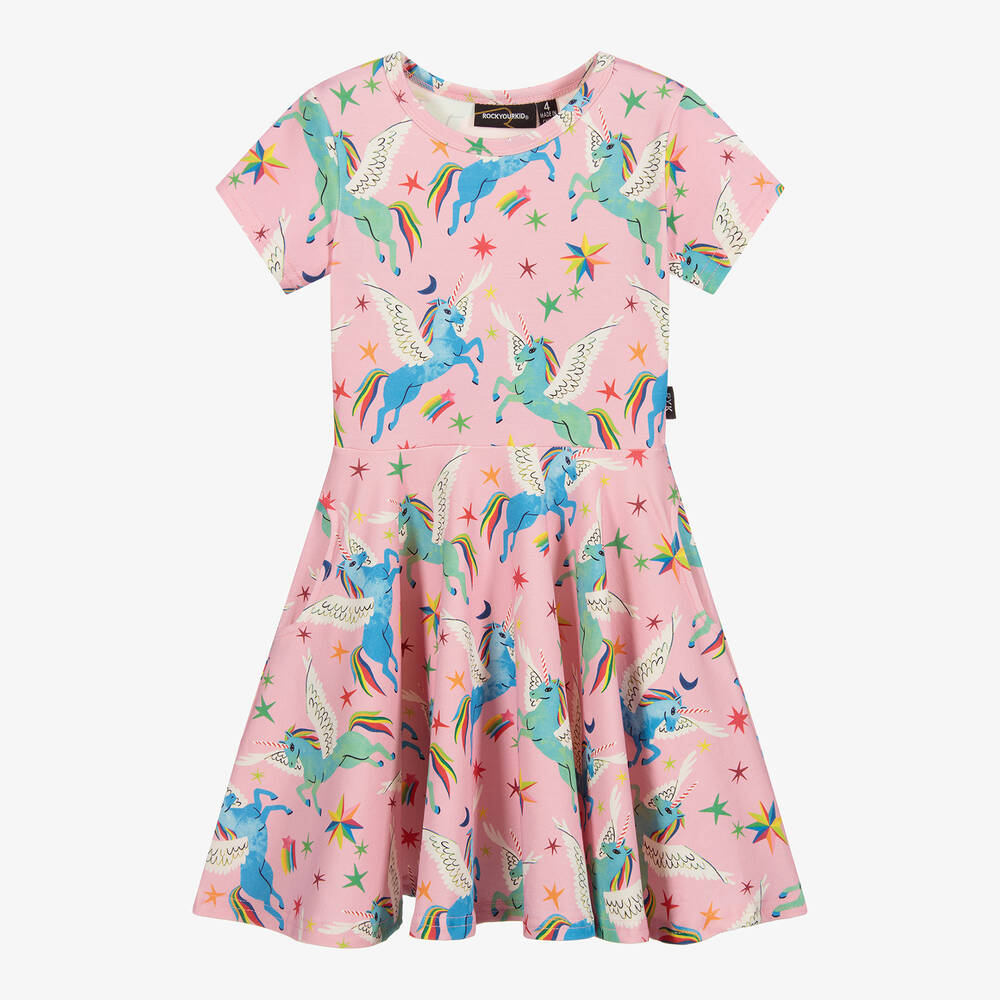 Pink dress for girls by Rock Your Baby, with a colourful rainbow Pegasus print. Made in soft cotton jersey, it has useful side pockets on the skirt.