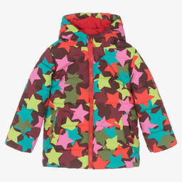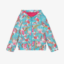 Jolly pink puffer jacket for girls by Rosalita Senoritas. Smooth and silky, this lightly padded jacket is vibrantly patterned with little horses and tonal pink clouds. With a feminine flared shape, it has a stylish tie on the waist, useful zipped pockets and a super soft and cosy fleece lining.