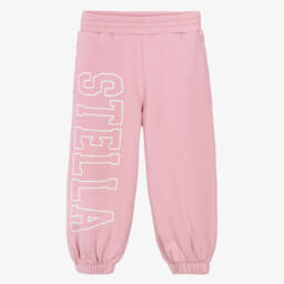 Girls' pink joggers by Stella McCartney Kids feature varsity-style branding along one leg, crafted in soft cotton jersey with a fleecy interior. Ideal for casual autumn and winter days, they include side seam pockets, a back pocket, and a comfortable elasticated waistband. The bold logo ensures instant recognition and adds a sporty touch. Limited quantities available, offering a last chance to buy this cosy essential for any girl's wardrobe.