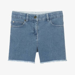 Teen girls pink shorts from the Stella McCartney Kids Active Wear collection. Made from silky, lightweight recycled polyester, they have bright blue trim and a green Airtex lining and edging. The elasticated waistband has a drawstring tie and there is a useful zip fastening pocket on the back.