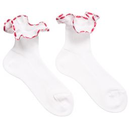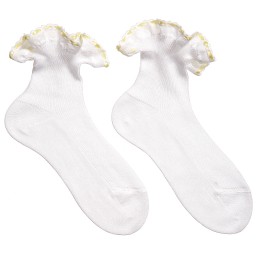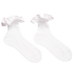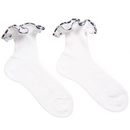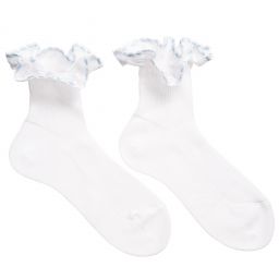 Girls white socks by Story Loris, featuring a woven ruffle on the cuff with an embroidered edge and blue ribbon threaded through. Soft and stretchy, they are made in fine knitted cotton with a delicate appearance.