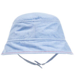 White sun hat for baby boys and girls by Sunuva, made in soft cotton. It has red trims and an elasticated chin strap with popper fastenings.