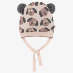 Blue knitted hat for baby boys and girls, by The Bonnie Mob. Made from a lovely blend of organic cotton and cashmere, it has a cute jacquard dog motif with gorgeous grey pom-poms.