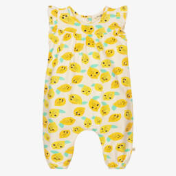 Colourful happy glasses add a fun touch to this ivory jumpsuit for baby girls by The Bonnie Mob. Made in soft organic cotton jersey, it is gathered from the bodice, with ruffles over the shoulders and popper fastenings on the back.