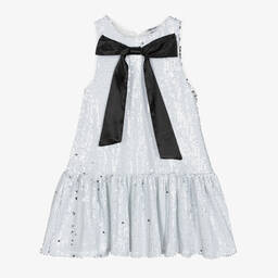 A pretty black sequin bow dress for girls by The Tiny Universe, embellished with matte sequins that sparkle in the light. Great for parties, it has a sleeveless style with a round neckline and a keyhole button fastening on the back. The tulle fabric is fully lined for comfort and the ruffled hem creates movement. A black satin bow stands out on the front and a tonal logo patch can be seen on the back. Limited quantities available.