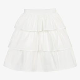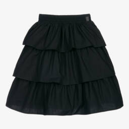 Girls dusky pink skirt by The Tiny Universe, made in lightweight cotton with tiered ruffles. It has an elasticated waistband with a faux leather logo tab and a lightweight cotton lining with a tulle underlayer for added volume