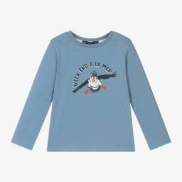 Casual, navy blue long-sleeved top for teen boys by American brand Timberland, made in soft, comfortable organic cotton. Great for relaxed days, the top has an orange logo graphic with 'Wind, Water, Earth and Sky' printed below in white.