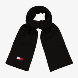 Black scarf for boys and girls by Tommy Hilfiger, made in a soft, ribbed cotton blend knit. Ideal for those colder days, this cosy scarf has the brand's iconic flag logo appliqué on one end for a distinctive designer look. This product is made with at least 50% organic cotton.