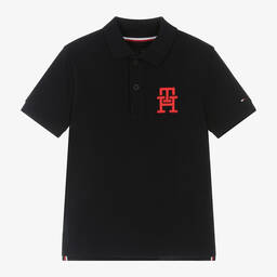 Navy blue cotton polo shirt for boys by Tommy Hilfiger, made from soft piqué fabric. Featuring ribbed trims, front button fastenings, and a red embroidered TH monogram logo on the chest, this stylish shirt is inspired by the adult collection. It has a split hem with signature red, white and blue striped trims and matching details inside the neck. The brand's flag logo is discreetly embroidered on one sleeve. Limited quantities available.