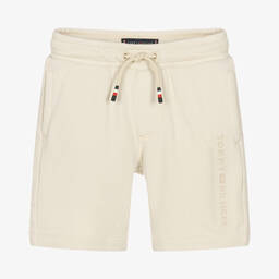 Casual green shorts for boys by Tommy Hilfiger, great for relaxed lounging. Made in soft cotton jersey, they have a tonal logo embroidery on one leg and tricolour striped drawstrings. There are slanted pockets on the front and a singular pouch pocket on the back, embroidered with the iconic flag logo for a branded finish.