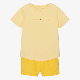 Sporty navy blue cotton shorts set for girls by American brand Tommy Hilfiger, made in comfortable jersey for relaxed days. The white T-shirt has a contrasting pink logo printed on the front, with the iconic embroidered flag logo on one sleeve. The navy blue shorts have a ribbed waistband with a white drawstring for a good fit and useful, jetted side pockets. They have an embroidered flag logo on one side.