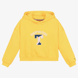 Pale grey marl hoodie for girls by American brand Tommy Hilfiger, made in comfortable cotton sweatshirt jersey with a cosy fleece feel inside. It has a varsity-style logo embroidered and appliquéd on the front in pink and blue, and the iconic flag logo is embroidered on one cuff.