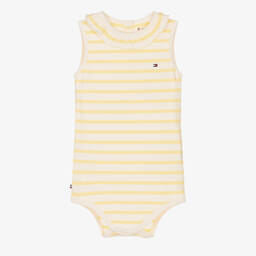 Ivory with navy blue stripes, this soft cotton jersey bodysuit for baby girls is by American brand Tommy Hilfiger. It has a feminine ruffle collar and the designer's iconic flag logo embroidered on the chest, with a logo tab on one side seam. It has popper fastenings on the back and also between the legs, so always stays neat and tidy.