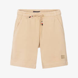 Boys blue cotton chino shorts by Tommy Hilfiger made from soft twill. These Bermuda shorts have an adjustable waistband for a comfortable fit. There are small holes on the back of the waistband from the tag.