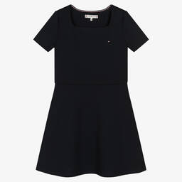 For teen girls, a navy blue and ivory striped dress from American brand Tommy Hilfiger with the iconic flag logo embroidered on the chest. With a square neckline and flared A-line skirt, this soft cotton jersey dress is casual and easy to wear.