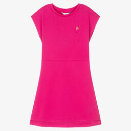 Smart-casual Mini-me pale pink pink dress for teen girls by Tommy Hilfiger, with a sparkly gold TH Monogram embroidered on the chest. Soft and stretchy with a double knit, the Milano jersey creates a stylish and streamlined silhouette, with pretty embroidered cutwork and the designer's iconic flag logo in metal on the hemline. It has capped sleeves and is easy to wear, simply pulling on.